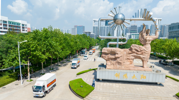 搬迁车辆驶过“创造太阳”雕塑 刘圣博摄影