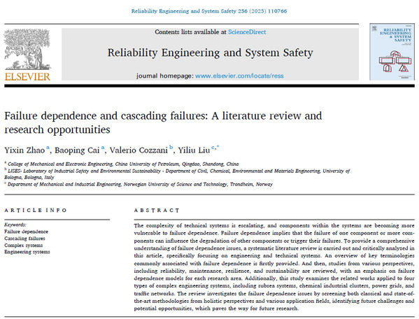 近日,机电工程系青年教师赵一新在复杂系统故障依赖及故障传播领域取得进展,研究成果《故障依赖及级联故障:文献综述和研究方向》(Failure dependence and cascading failures: A literature review and research opportunities)发表在《Reliability Engineering and System Safety》。《Reliability Engineering and System Safety》是可靠性工程领域的国际顶级期刊,目前影响因子为9.4(SCI一区Top)。该研究由我校与挪威科技大学、博洛尼亚大学合作完成,青年教师赵一新为论文第一作者,中国石油大学(华东)为第一署名单位。该研究得到了国家重点研发计划、国家自然科学基金、工信部高技术船舶科研项目、山东省杰出青年基金以及“泰山学者”项目的联合资助。