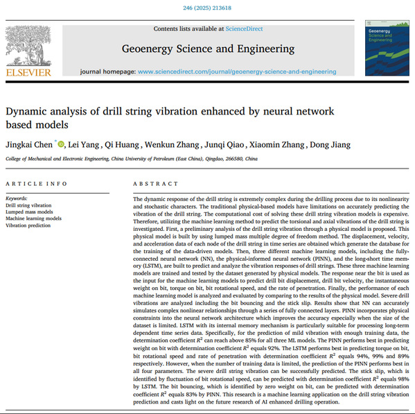 近日,陈敬凯副教授团队机械工程2023级专业硕士研究生杨磊在钻柱振动智能预测方面的研究取得重要进展,相关研究成果《基于神经网络模型的钻柱振动动态分析研究》(Dynamic Analysis of Drill String Vibration Enhanced by Neural Network Based Models) 发表于《Geoenergy Science and Engineering》,该期刊是石油工程领域中的国际顶级期刊,2023年影响因子为5.168 (SCI二区Top)。论文第一作者与通讯作者为陈敬凯副教授,第二作者硕士研究生杨磊为该研究工作和论文撰写做出重要贡献,中国石油大学(华东) 为第一署名单位和唯一通讯单位,该研究得到中央高校基本科研业务费专项资金、海洋物探及勘探开发装备国家工程研究中心开放基金、山东省自然科学基金、国家自然科学基金联合资助。