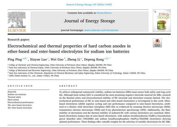 近日,油气及新能源安全团队(ONES)在钠离子电池用电解液安全性能评估方面取得重要进展。研究成果《钠离子电池用醚类和酯类电解液中硬碳负极的电化学和热安全性能研究》(Electrochemical and thermal properties of hard carbon anodes in ether-based and ester-based electrolytes for sodium ion batteries)发表于《Journal of Energy Storage》。《Journal of Energy Storage》是一本专注于储能领域的学术期刊,目前影响因子为8.9(SCI二区Top)。第一作者为平平副教授,通讯作者为孔得朋教授和平平副教授,论文第二作者为2022级硕士学生罗馨悦,中国石油大学(华东)为第一署名单位和通讯单位,该研究得到了国家自然科学基金和国家重点研发项目的资助支持。