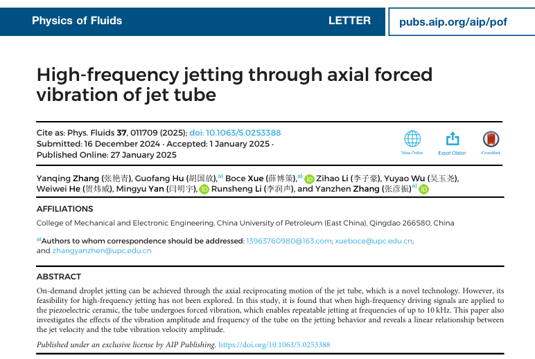 近日,我院机械工程硕士研究生张艳青在高频按需喷墨打印领域取得研究进展,相关研究成果《通过喷管的轴向受迫振动实现高频按需喷射》(High-frequency jetting through axial forced vibration of jet tube)发表在《Physics of Fluids》期刊。Physics of Fluids是流体力学领域的国际知名期刊,目前影响因子为4.1(SCI二区)。该研究中硕士研究生张艳青为第一作者,通讯作者为我院张彦振教授、青年教师薛博策和博士研究生胡国放,中国石油大学(华东)为唯一署名单位和通讯单位。研究工作得到国家自然科学基金,山东省优秀青年基金以及“泰山学者”青年专家计划等项目的资助。
