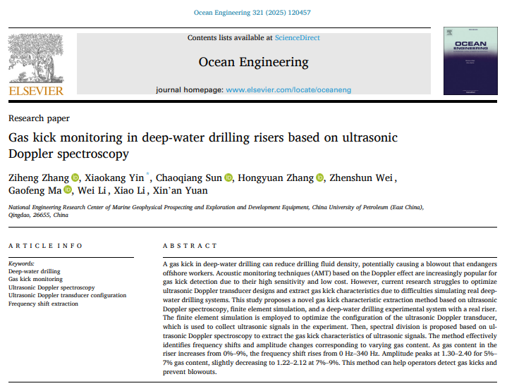 近日,安全科学与工程学科博士研究生张紫衡在深水钻井气侵监测方面取得研究进展,相关研究成果《基于超声多普勒频谱的深水钻井隔水管内气侵监测方法》(Gas kick monitoring in deep-water drilling risers based on ultrasonic Doppler spectroscopy)发表在《Ocean Engineering》。《Ocean Engineering》是海洋工程领域的国际顶级期刊,目前影响因子为4.6。论文第一作者为博士研究生张紫衡,通讯作者为殷晓康教授,中国石油大学(华东)为第一署名单位和通讯单位,该研究得到国家自然科学基金及“泰山学者”青年专家计划等项目的联合资助。