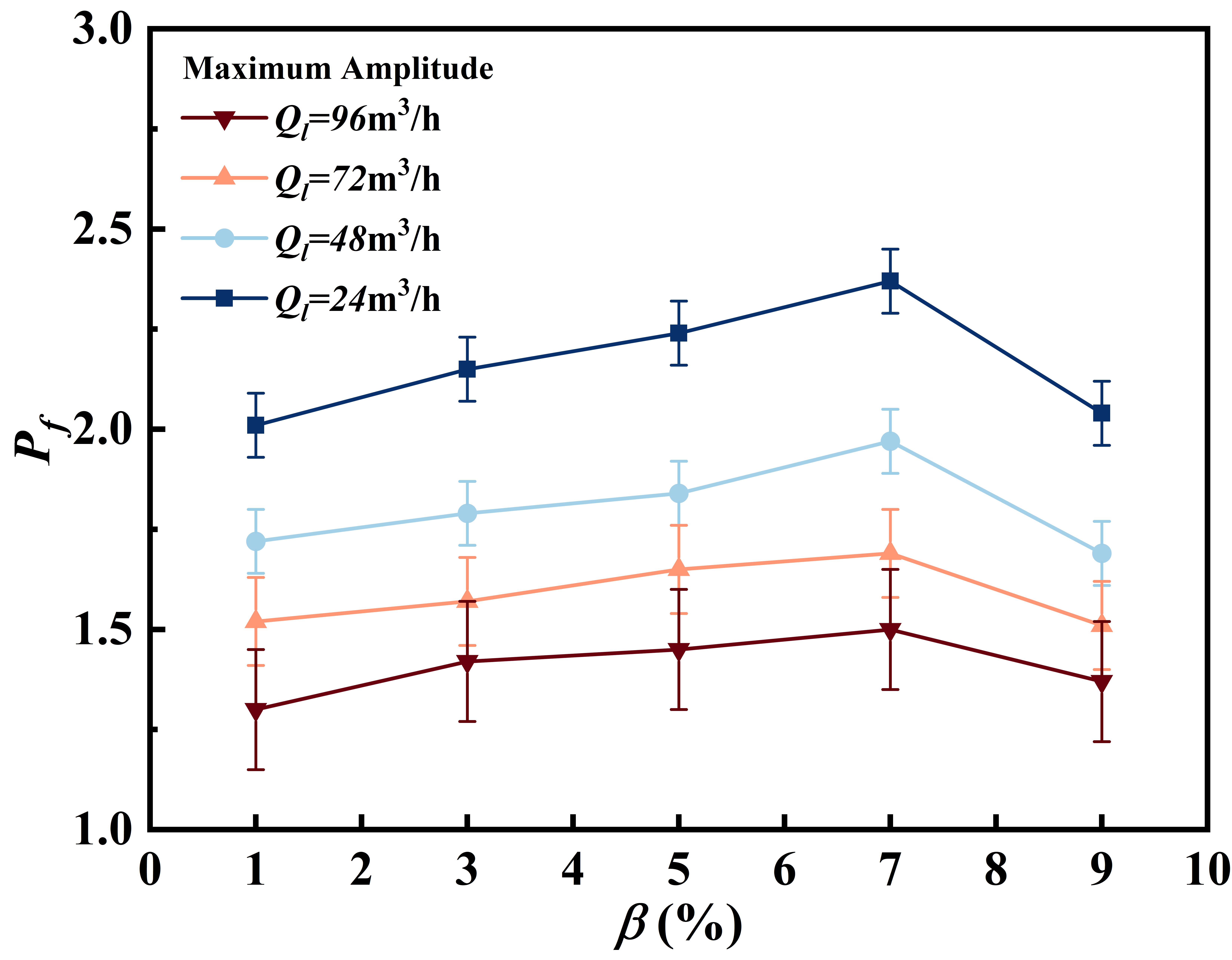不同液相流量下声波接收信号的频谱峰值随含气率变化关系