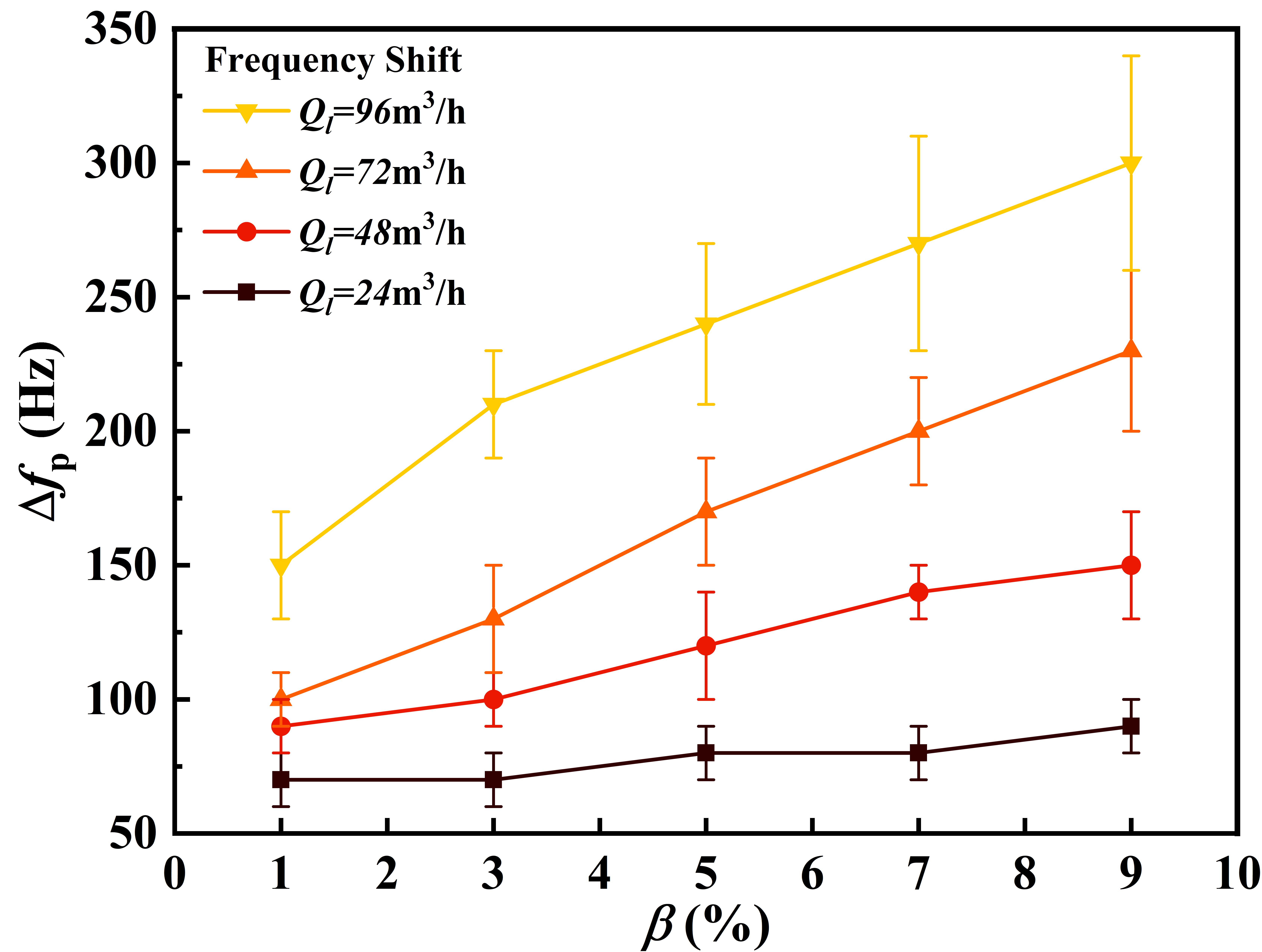 不同液相流量下声波接收信号的频移随含气率变化关系