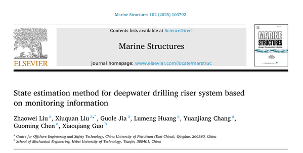 近日,安全科学与工程学科博士研究生刘兆伟在钻井隔水管系统状态估计方面取得重要进展,相关研究成果《基于监测信息的深水钻井隔水管系统状态估计方法》(State estimation method for deepwater drilling riser system based on monitoring information)发表在《Marine Structures》。《Marine Structures》是海洋工程领域的知名期刊,目前影响因子为4.0(SCI二区)。论文第一作者为博士研究生刘兆伟,通讯作者为刘秀全教授,中国石油大学(华东)为第一署名单位和唯一通讯单位,该研究得到国家重点研发计划、国家自然科学基金,工业和工信部船舶高技术研究项目等联合资助。