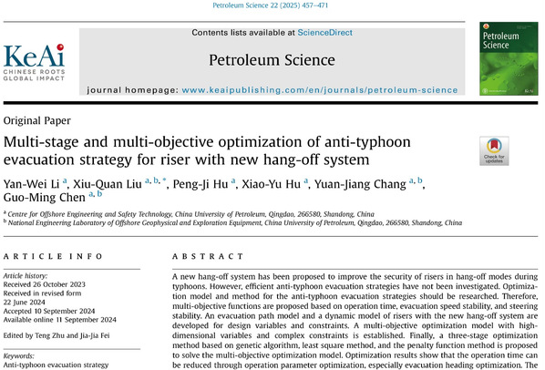 近日,安全科学与工程学科博士研究生李彦伟在隔水管与新型悬挂系统防台风撤离策略的优化研究方面取得重要进展,相关研究成果《隔水管与新型悬挂系统防台风撤离策略的多阶段多目标优化》(Multi-stage and multi-objective optimization of anti-typhoon evacuation strategy for riser with new hang-off system)发表在《Petroleum Science》。《Petroleum Science》是一本涵盖石油科学和技术领域的国际著名学术期刊(国家领军期刊),目前影响因子为6.0(SCI一区)。论文第一作者为李彦伟博士,中国石油大学(华东)为第一署名单位和唯一通讯单位,该研究得到国家自然科学基金、国家重点研发计划、工信部高技术船舶科研项目等项目的联合资助。