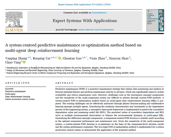 近日,机械工程专业博士研究生张妍平在海洋石油装备预测性维修优化方法方面取得重要进展,相关研究成果《基于多智能体深度强化学习的系统中心化预测性维修二次优化方法》(A system-centred predictive maintenance re-optimization method based on multi-agent deep reinforcement learning)发表在《Expert Systems With Applications》。《Expert Systems With Applications》是计算机科学和人工智能领域的国际顶级期刊,目前影响因子为7.5。论文第一作者为博士研究生张妍平,通讯作者为蔡宝平教授,中国石油大学(华东)为第一署名单位和唯一通讯单位。该研究得到了国家重点研发计划、国家自然科学基金、工信部高技术船舶科研项目及山东省杰出青年基金项目的联合资助。