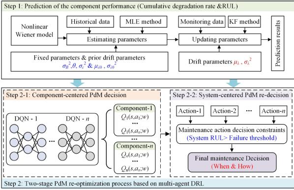 预测性维修是一种主动维修策略,通过数据监测和分析来预测潜在故障并提前执行维修活动,从而显著提高系统可用性并降低维修成本。本文提出了一种基于多智能体深度强化学习的系统中心化预测性维修优化方法。考虑到工程系统退化过程中的非线性特性和不确定性,采用了一种协同数据-模型框架来预测累积退化值和剩余使用寿命。累积退化量和剩余使用寿命的预测值作为多环境观测值,用于平衡多智能体深度强化学习中的环境动态性。考虑到组件间的差异,首先根据组件的最优性能和维护成本做出以组件为中心的预测性维修决策。鉴于多组件系统的复杂性,在组件级决策结果和系统性能约束的基础上,对系统中心化的预测性维修决策进行二次优化。
