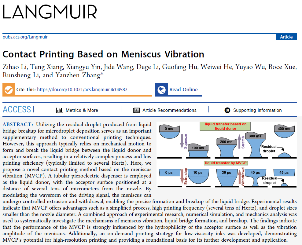 近日,张彦振教授团队机械工程专业博士研究生李子豪在微纳液滴生成与操控领域取得重要进展,相关研究成果《基于弯液面振荡的接触式打印》(Contact Printing Based on Meniscus Vibration)发表在《Langmuir》期刊。该期刊是胶体与界面领域的高水平期刊,2024年影响因子为3.7(SCI二区)。该研究中博士研究生李子豪为第一作者,通讯作者为张彦振教授,中国石油大学(华东)为第一署名单位和通讯单位。研究工作得到国家自然科学基金,山东省优秀青年基金以及“泰山学者”青年专家计划等项目的大力支持。