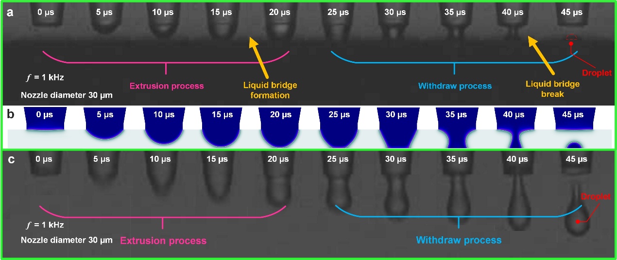 针对以上问题本文提出了一种利用弯液面受迫振荡的接触式打印(MVCP)新策略,相较于利用机械运动拉断液桥的打印方式,本方法具有工序简单、打印频率高和打印墨滴尺寸小于喷孔尺寸的优点。首先通过实验证明了MVCP按需打印微米级尺寸墨滴的可行性,之后并结合数值模拟和力学分析详细研究了MVCP中液桥的形成和断裂机理,并总结了系统参数对生成墨滴尺寸的影响规律,此外还开发了适用于MVCP的快速按需打印模式。该技术的提出对于提升基于液桥断裂生成墨滴技术的打印精度和打印效率,具有重要的理论和技术意义。