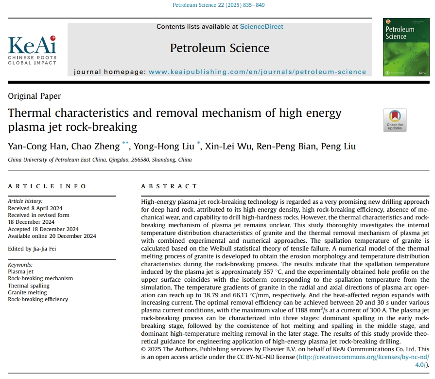 近日,刘永红教授团队机械工程专业博士研究生韩延聪在高能等离子射流破岩方面取得重要进展,相关研究成果《高能等离子射流破岩的热特性及去除机理》(Thermal characteristics and removal mechanism of high energy plasma jet rock-breaking)发表在《Petroleum Science》上。《Petroleum Science》是石油工程领域的国际顶级期刊,目前影响因子为6.0(SCI一区)。论文第一作者为博士研究生韩延聪,通讯作者为刘永红教授和郑超教授,中国石油大学(华东)为唯一署名和唯一通讯单位。该研究得到山东省海外优青、山东省泰山学者项目、国家自然科学基金、装备预研教育部联合基金、国家资助博士后研究人员项目、山东省博士后创新项目等的联合资助。
