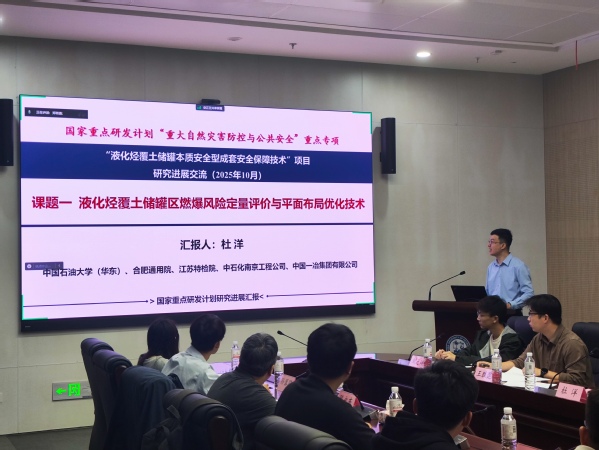 10月15日,国家重点研发计划课题《液化烃覆土储罐区燃爆风险定量评价与平面布局优化技术》推进会顺利召开。项目负责人、合肥通用机械研究院副总工程师陈永东,中国石油大学(华东)威廉希尔体育党委书记殷晓康教授,江苏省特检院浦江院长,中石化南京工程有限公司朱娟娟高工,中国一冶集团有限公司周红东总工,课题负责人杜洋教授以及各参研单位任务负责人、技术骨干共同参会。