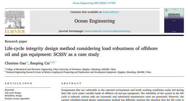 近日,我院机械工程专业博士研究生高春坦在海洋油气装备结构完整性设计方法方面取得重要进展,相关研究成果《考虑负载鲁棒性的海洋油气装备全寿命周期完整性设计方法研究——以井下安全阀为例》(Life-cycle integrity design method considering load robustness of offshore oil and gas equipment: SCSSV as a case study)发表在《Ocean Engineering》。《Ocean Engineering》是海洋工程领域的国际顶级期刊,目前影响因子为5.0。论文第一作者为博士研究生高春坦,通讯作者为蔡宝平教授,中国石油大学(华东)为第一署名单位和唯一通讯单位。该研究得到国家重点研发计划、国家自然科学基金、工信部高技术船舶科研项目专题、山东省杰出青年基金以及“泰山学者”青年专家计划的联合资助。