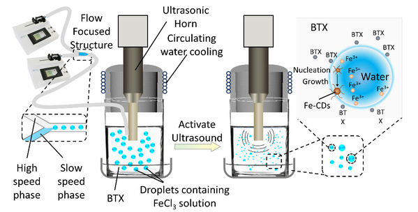 零维碳基纳米材料,简称碳点(CDs)由于其丰富的表面官能团和优异的光稳定性,在传感和光催化等领域得到了广泛的应用。然而,常规碳点内部的电子-空穴复合速率过快,严重影响了其性能。金属掺杂碳点(M−CDs)可以改变CDs的电子传输性质和表面特性。然而,在温和条件下精确可控地制备碳纳米材料是一个很大的挑战,特别是金属催化多相制备。常见的水热法和微波法存在过程耗时,安全性低,产物性能差等缺陷。而槽式超声波辅助的方法很好地解决了安全性差的问题,但仍较为耗时,这与工业应用要求相悖。