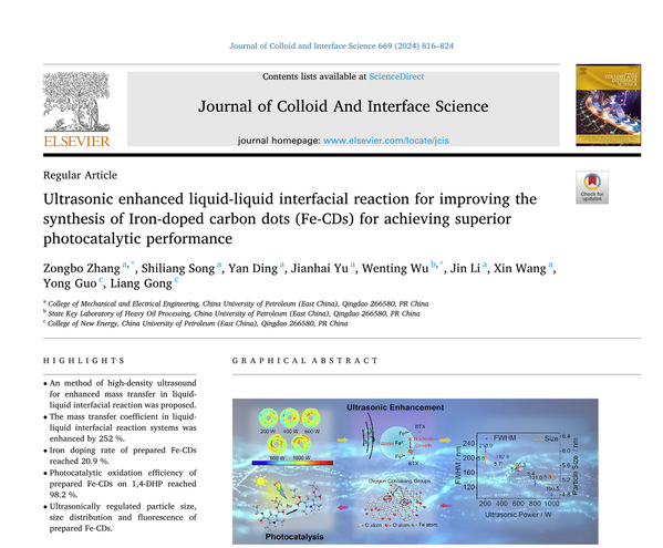 近日,我院张宗波教授在金属改性纳米材料的多相制备领域取得重要进展,相关研究成果《超声波增强液-液界面反应改进铁掺杂碳点(Fe-CDs)以实现优异的光催化性能》(Ultrasonic enhanced liquid-liquid interfacial reaction for improving the synthesis of Iron-doped carbon dots (Fe-CDs) for achieving superior photocatalytic performance)发表在《JOURNAL OF COLLOID AND INTERFACE SCIENCE》。《JOURNAL OF COLLOID AND INTERFACE SCIENCE》是致力于有关胶体与界面科学基本原理及其在先进材料、纳米医学、能源及相关领域概念性新应用的国际顶级期刊,目前影响因子为9.9(SCI一区Top)。论文第一作者与通讯作者为张宗波教授,共同通讯作者为化学化工学院的吴文婷教授,论文第二作者为2021级学术硕士宋世良,中国石油大学(华东)为独立完成单位,该研究得到国家自然科学基金、山东省自然科学基金及青岛市自然科学基金等项目的资助。