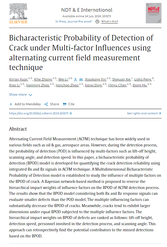 近日,智能传感与无损检测团队在ACFM缺陷检出概率方面取得重要进展。研究成果《基于交流电场测量技术的多因素影响下裂纹双特征检测概率》(Bicharacteristic Probability of Detection of Crack under Multi-factor Influences using alternating current field measurement technique)发表于无损检测领域国际顶级期刊《NDT & E International》(年发文量180篇),最新影响因子达到4.1,中科院大类分区2区。