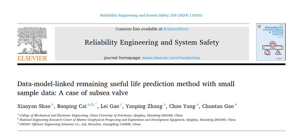 近日,我院机械工程专业博士研究生邵筱焱在海洋油气装备剩余使用寿命预测方向取得重要进展,相关研究成果《小子样数据下数模联动的剩余使用寿命预测方法:以水下阀门为例》(Data-model-linked remaining useful life prediction method with small sample data: A case of subsea valve)发表在《Reliability Engineering and System Safety》。《Reliability Engineering and System Safety》是可靠性工程领域的国际顶级期刊,目前影响因子为9.4。论文第一作者为博士研究生邵筱焱,通讯作者为蔡宝平教授,中国石油大学(华东)为第一署名单位和唯一通讯单位。该研究得到国家重点研发计划、国家自然科学基金、工信部高技术船舶科研项目专题、山东省杰出青年基金以及“泰山学者”青年专家计划的联合资助。