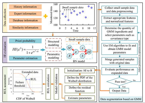 剩余使用寿命预测对于设备维护规划和提高整体运营效率至关重要。针对退化模型与有限数据之间的交互能力较弱,预测模型处理随机性和误差的能力差,导致预测精度不高,预测结果不可靠这一挑战,该文提出了一种使用小样本数据并利用数据和模型联动模型进行剩余使用寿命预测的新方法。
