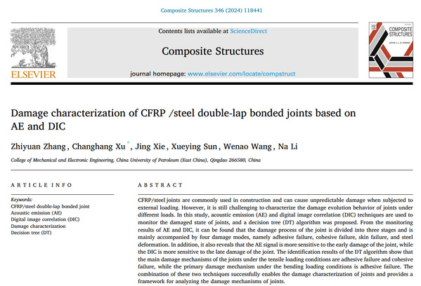 近日,我院安全科学与工程学科博士研究生张志远在CFRP/钢双搭接粘接接头损伤表征领域取得研究进展,相关研究成果《基于AE和DIC的CFRP/钢双搭接粘接接头损伤表征》(Damage characterization of CFRP /steel double-lap bonded joints based on AE and DIC)发表在《Composite Structures》。《Composite Structures》是复合材料领域顶级期刊,目前影响因子为6.3(SCI二区Top)。论文第一作者为博士研究生张志远,通讯作者为徐长航教授,中国石油大学(华东)为独立完成单位。