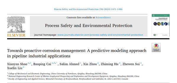 近日,我院机械工程专业博士研究生邵筱焱在管道腐蚀管理及剩余使用寿命预测方向取得重要进展,相关研究成果《迈向主动腐蚀管理:一种管道工业的预测性建模方法》(Towards proactive corrosion management: A predictive modeling approach in pipeline industrial applications)发表在《Process Safety and Environmental Protection》。《Process Safety and Environmental Protection》是石油化工行业过程安全和环境保护方向的顶级期刊,目前影响因子为6.9。论文第一作者为博士研究生邵筱焱,通讯作者为蔡宝平教授,中国石油大学(华东)为第一署名单位。该研究得到国家重点研发计划、国家自然科学基金、工信部高技术船舶科研项目专题、山东省杰出青年基金以及“泰山学者”青年专家计划的联合资助。