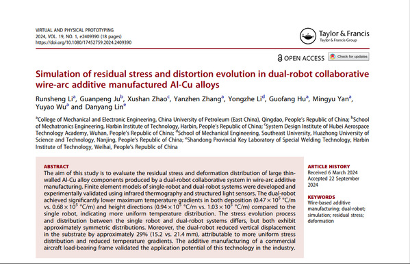 近日,我院机电工程系青年教师李润声在航空航天领域增材制造方向取得重要进展,相关研究成果《双机器人协同电弧增材制造Al-Cu合金残余应力演化与变形数值模拟》(Simulation of residual stress and distortion evolution in dual-robot collaborative wire-arc additive manufactured Al-Cu alloys)发表于《Virtual and PhysicalPrototyping》期刊。《Virtual and Physical Prototyping》是制造领域的国际顶级期刊,2023年影响因子为10.2(SCI一区)。文章由中国石油大学(华东)联合哈尔滨工业大学(本部及威海校区),湖北航天技术研究院总体设计所以及东南大学合作完成,论文第一作者为机电工程系青年教师李润声,该研究得到中央高校基本科研项目,山东省自然科学基金与青岛市自然科学基金联合资助。