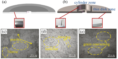 光镜OM试样取样位置及结果。(a)毛坯取样位置。(b)工件取样位置。(c)毛坯OM结果。(d)工件隆起区的OM结果。(e)工件减薄区OM结果。