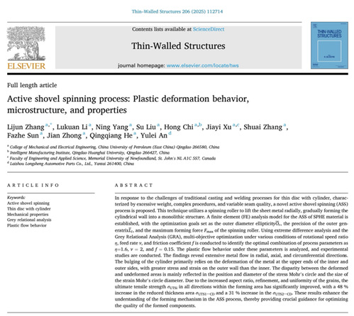 近日,我院张立军教授团队在汽车发动机风扇带轮铲旋工艺方面取得重要进展,相关研究成果《主动铲旋旋压工艺:塑变行为、微观结构和力学性能》(Active shovel spinning process: Plastic deformation behavior, microstructure, and properties)发表在《Thin-Walled Structures》。《Thin-Walled Structures》是工程技术领域的国际顶级期刊,目前影响因子为5.7(SCI一区TOP)。论文第一作者和通讯作者为张立军教授,论文第二作者为2022级硕士学生李陆宽。中国石油大学(华东)为第一署名单位,青岛黄海学院、加拿大纽芬兰纪念大学和莱州龙生汽车零部件有限公司为共同合作单位,该研究得到山东省重点研发计划(科技型中小企业创新能力提升工程)项目资助。