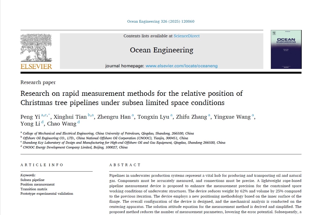 近日,我院伊鹏老师团队硕士研究生田兴辉在浅水水下生产系统管道回接测量方法研究方面取得重要进展,相关研究成果《海底有限空间条件下采油树管道相对位姿快速测量方法研究》(Research on rapid measurement methods for the relative position of Christmas tree pipelines under subsea limited space conditions)发表在《Ocean Engineering》。该期刊在海洋工程领域具有较高影响力,目前影响因子为4.6(SCI二区)。论文第一作者与通讯作者为伊鹏副教授,第二作者为硕士研究生田兴辉,中国石油大学(华东)为第一署名单位和唯一通讯单位。该研究得到山东省海洋工程装备与材料创新创业项目的资助。