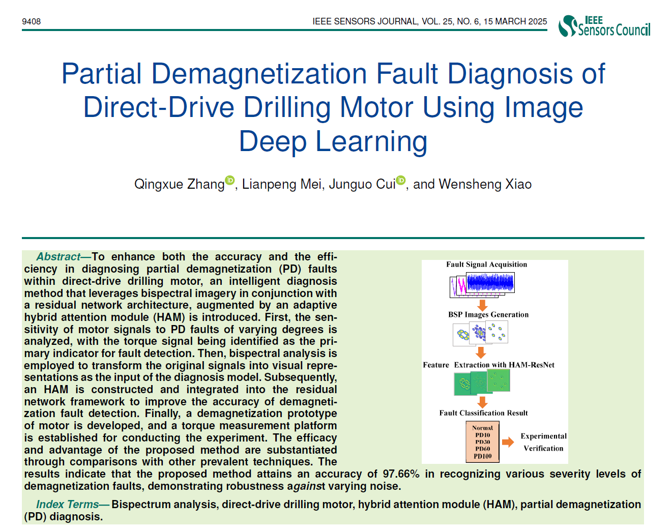 近日,我院机械工程学科博士研究生张庆雪在永磁同步电机退磁故障诊断方面取得重要进展,相关研究成果《应用图像深度学习的直驱钻井电机局部退磁故障诊断》(Partial Demagnetization Fault Diagnosis of Direct-drive Drilling Motor Using Image Deep Learning)发表在《IEEE Sensors Journal》上。《IEEE Sensors Journal》为传感器工程和技术领域的国际知名期刊,具有较高的认可度,目前影响因子为4.3(SCI二区)。论文第一作者为博士研究生张庆雪,通讯作者为崔俊国副教授,中国石油大学(华东)为第一署名单位和唯一通讯单位,该研究得到了国家重点研发计划项目的资助支持。