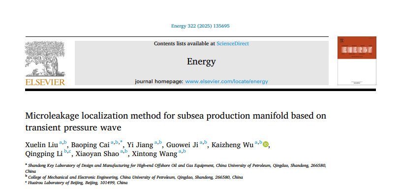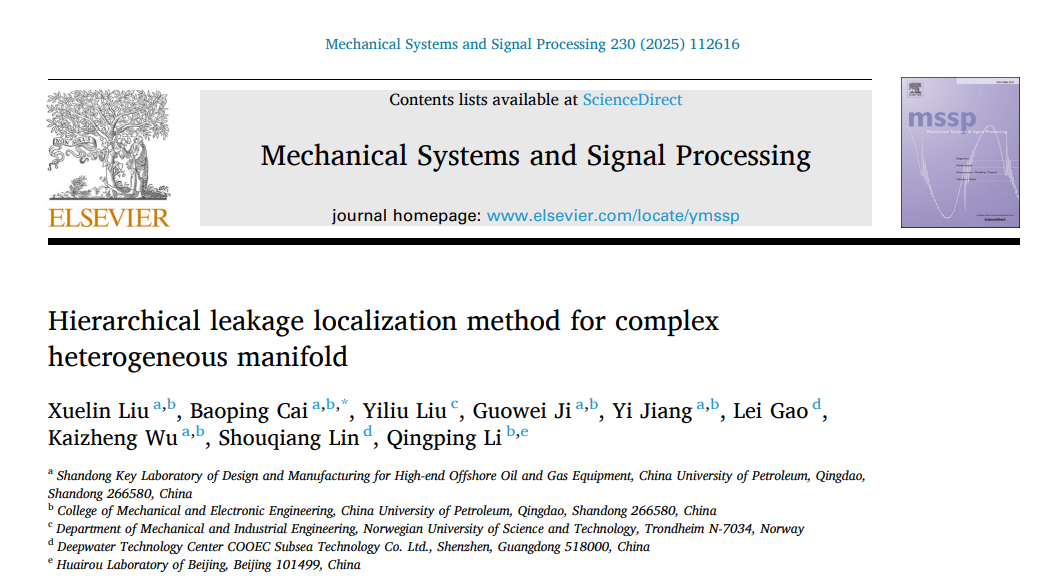 近日,我院机械工程学科博士研究生刘雪琳在水下生产管汇泄漏定位方面取得重要进展,相关研究成果《复杂异构管汇泄漏逐级定位方法》(Hierarchical leakage localization method for complex heterogeneous manifold)发表在《Mechanical Systems and Signal Processing》,《Mechanical Systems and Signal Processing》是工程技术领域的知名期刊,目前影响因子为7.9(SCI一区TOP)。相关研究成果《基于瞬态压力波的水下生产管汇微小泄漏定位方法》(Microleakage localization method for subsea production manifold based on transient pressure wave)发表在《Energy》,《Energy》是工程技术领域的知名期刊,目前影响因子为9.0(SCI一区TOP)。论文第一作者为博士研究生刘雪琳,通讯作者为蔡宝平教授,中国石油大学(华东)为第一署名单位和唯一通讯单位。该研究得到了国家重点研发计划、国家自然科学基金、工信部高技术船舶科研项目及山东省杰出青年基金项目的联合资助。