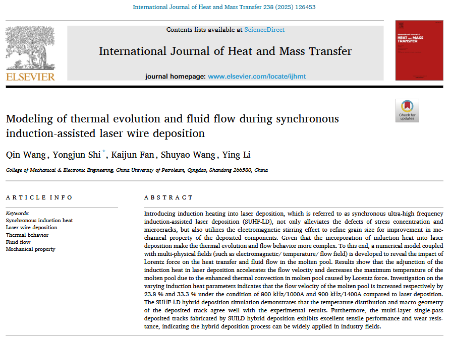 近日,我院机械工程学科博士研究生王芹在激光/超高频感应复合增材制造方面取得重要进展,相关研究成果《同步感应辅助激光熔丝沉积过程中的热演化与流体流动模型》(Modeling of thermal evolution and fluid flow during synchronous induction-assisted laser wire deposition)发表在《International Journal of Heat and Mass Transfer》。《International Journal of Heat and Mass Transfer》是工程技术热力学领域的知名期刊,目前影响因子为5(SCI二区top)。论文第一作者为博士研究生王芹,通讯作者为石永军教授,中国石油大学(华东)为第一署名单位和唯一通讯作者,该研究得到山东省自然科学基金与国家自然科学基金项目的资助。