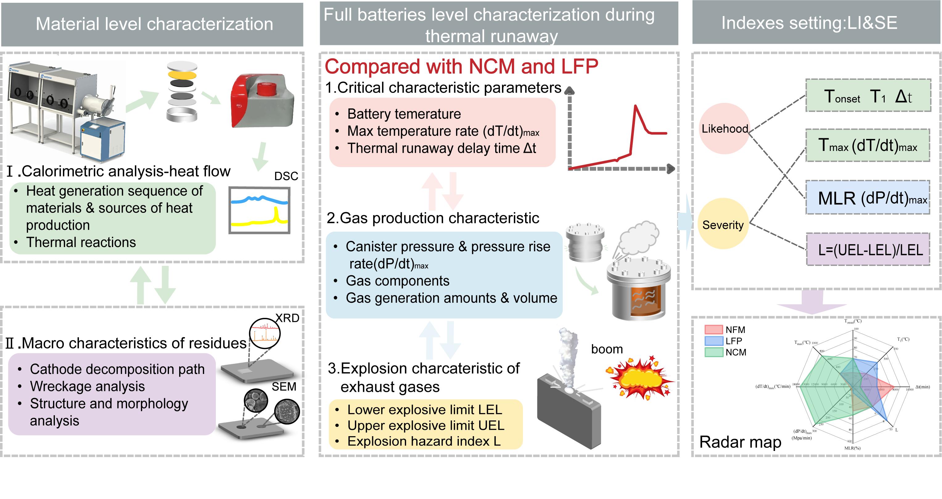 本文通过全面、多层次的比较,系统地研究了商用钠离子电池的危险性。这项研究首先分析了具有不同正极材料的电池在热失控前后的本质安全性能。通过整合多维分析结果,并考虑钠离子热失控的特征温度、时间、排气压力和气体成分等参数,我们提出了一种综合评估方法,用于分析电池热失控的可能性和严重性。结果表明,钠离子电池的热危害的可能性和严重性以及燃爆的直接危险程度均介于磷酸铁锂电池和三元锂电池之间,但异常起始放热温度较低。本文提供了一个不局限于任何特定化学材料的多参数、多尺度安全评估框架。基于本研究的结果,未来的研究可以从材料设计和安全保护协同优化的角度开展。