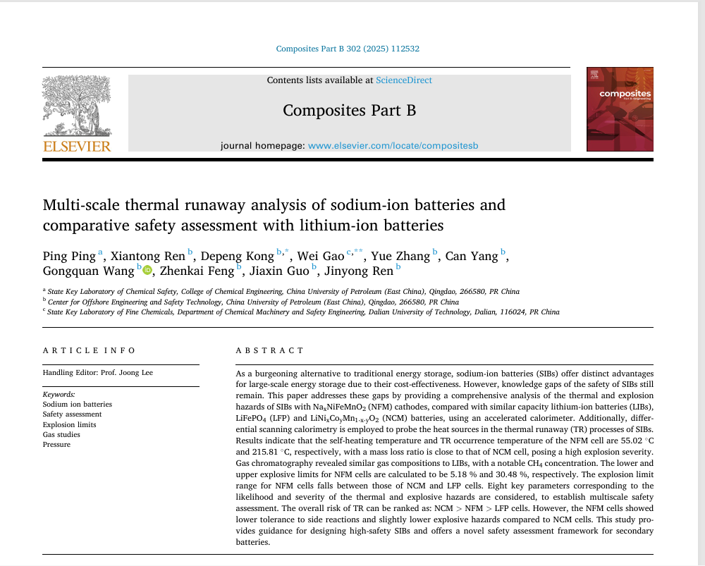 近日,油气及新能源安全团队(ONES)在钠离子电池热失控安全评估方面取得重要进展,相关研究成果《钠离子电池多尺度热失控分析与锂离子电池对比安全评估》(Multi-scale thermal runaway analysis of sodium-ion batteries and comparative safety assessment with lithium-ion batteries)发表在《Composites Part B》。该期刊是复合材料领域的国际知名期刊,目前影响因子为12.7(SCI一区Top)。第一作者为平平副教授,通讯作者为孔得朋教授,论文第二作者为2023级硕士学生任宪通,中国石油大学(华东)为第一署名单位和通讯单位,该研究得到了国家自然科学基金和国家重点研发项目的资助支持。