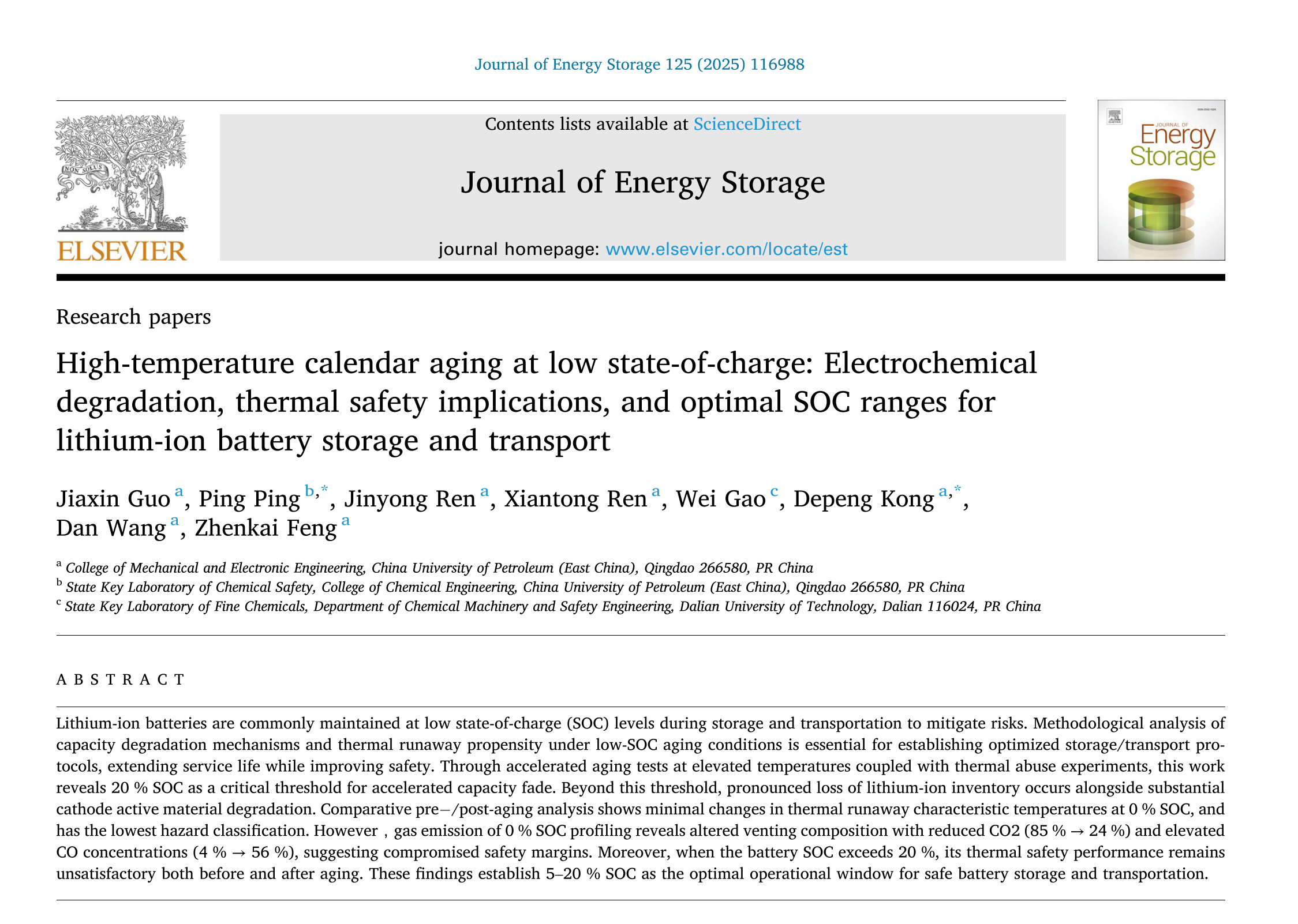 近日,油气及新能源安全团队(ONES)在锂离子电池老化与热失控安全评估方面取得重要进展,相关研究成果《低荷电状态下的高温日历老化:电化学老化、热安全影响和锂离子电池储运的最佳SOC范围》(High-temperature calendar aging at low state-of-charge: Electrochemical degradation, thermal safety implications, and optimal SOC ranges for lithium-ion battery storage and transport)发表在《Journal of Energy Storage》。该期刊是储能领域的国际知名期刊,目前影响因子为8.9(SCI二区Top)。第一作者为2023级威廉希尔体育郭嘉欣,通讯作者为孔得朋教授与平平副教授,中国石油大学(华东)为第一署名单位和通讯单位,该研究得到了国家自然科学基金和国家重点研发项目的资助支持。