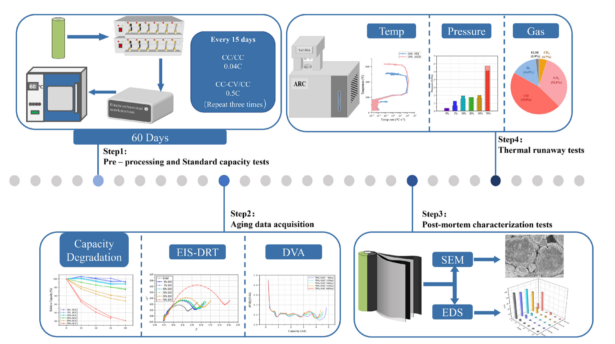 本研究系统性探究了不同SOC水平下锂离子电池在高温加速老化过程中老化机理与热安全性。通过电化学分析和材料表征手段评估容量保持率、阻抗变化和电极衰退规律,采用加速量热仪(ARC)测定热失控行为特征参数(包括临界温度阈值和产气特性)。研究旨在探寻既能有效缓解老化又能维持热稳定性的最优SOC区间,为锂离子电池储运安全规范提供理论依据。