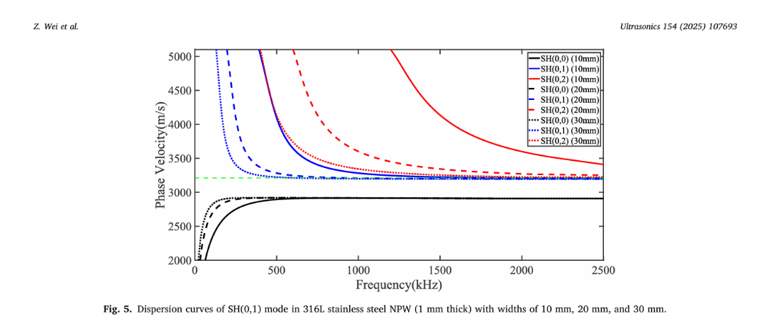 不同宽度的1mm厚NPW中SH(0,1)模态的频散曲线