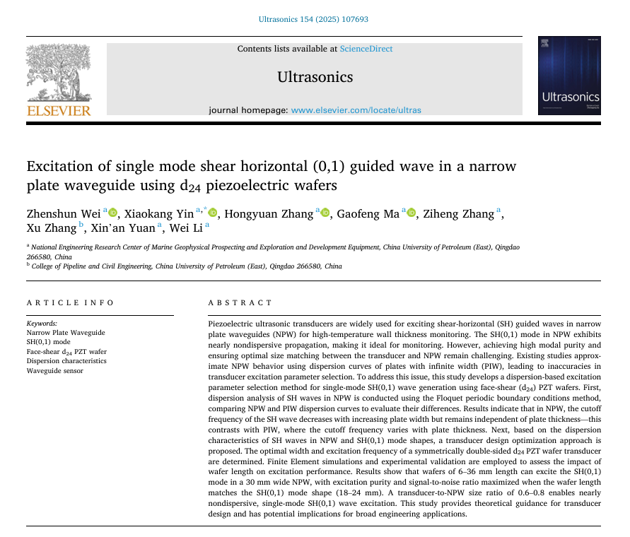 近日,我院机械工程学科硕士研究生魏振顺在高温壁厚在线监测关键技术——窄板波导中单一SH(0,1)模态导波激励研究方面取得重要进展。相关研究成果《使用d24型压电片在有限宽平板中激励单一SH(0,1)模态的方法研究》(Excitation of Single Mode Shear Horizontal (0,1) Guided Wave in a Narrow Plate Waveguide Using d24 Piezoelectric Wafers)发表在《Ultrasonics》期刊上。《Ultrasonics》是国际知名的无损检测与超声技术领域学术期刊,目前影响因子为3.8(SCI二区top)。论文第一作者为硕士研究生魏振顺,通讯作者为殷晓康教授,中国石油大学(华东)为独立完成单位,该研究得到国家自然科学基金及“泰山学者”青年专家计划等项目的联合资助。