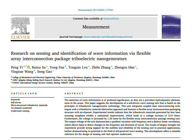 近日,我院伊鹏老师团队机械工程专业硕士研究生苏瑞旭在海洋等效波浪信息感知研究方面取得重要进展,相关研究成果《基于柔性阵列互连封装摩擦纳米发电机的波信息感知与识别研究》(Research on sensing and identification of wave information via flexible array interconnection package triboelectric nanogenerators)发表在《Measurement》。《Measurement》是测量领域的国际顶级期刊,目前影响因子为5.2(SCI二区Top)。论文第一作者与通讯作者为伊鹏副教授,第二作者为硕士研究生苏瑞旭,中国石油大学(华东)为第一署名单位和唯一通讯单位。该研究得到中国国家重点研发计划的资助。