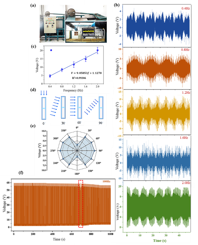 利用激光加工技术加工过的感知单元可以对海洋波浪信息进行精确与灵敏的识别,主要包括波浪的两大基本特征:频率,方向。利用波浪自身的机械能对摩擦纳米发电感知单元进行冲击,发电感知单元将会输出电信号,将输出的电信号进行处理后绘图,处理后的电信号将会反映波浪的特征。