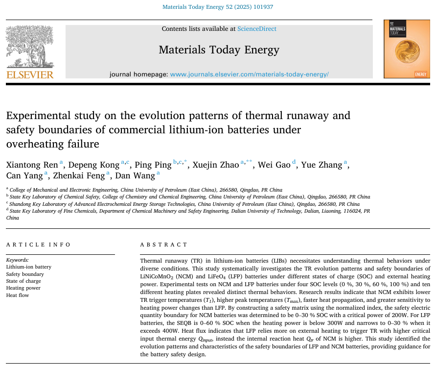 近日,油气及新能源安全团队(ONES)在过热故障诱导商用锂离子电池热失控的安全边界方面取得重要进展,相关研究成果《过热故障条件下商用锂离子电池热失控演化规律和安全边界的实验研究》(Experimental study on the evolution patterns of thermal runaway and safety boundaries of commercial lithium-ion batteries under overheating failure)发表在《Materials Today Energy》。该期刊是国际能源领域的知名期刊,目前影响因子为8.7(SCI二区)。第一作者为2023级威廉希尔体育任宪通,通讯作者为平平副教授,中国石油大学(华东)为第一署名单位和通讯单位,该研究得到了国家重点研发项目和国家自然科学基金和的资助支持。