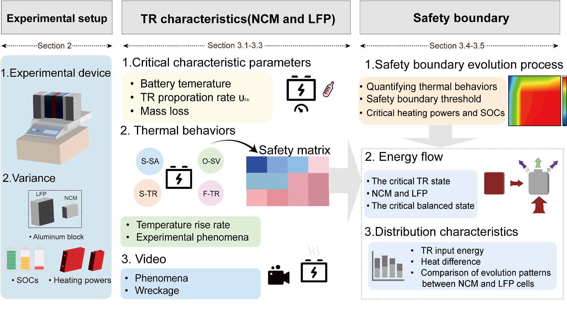 在储能系统中,锂离子电池性能优异、能量密度高,已被广泛应用于便携式电子设备和电动汽车。不断升级的全球能源危机和环境污染凸显了对可持续能源解决方案的迫切需求。过去几年中,锂离子电池(LIBs)在医疗设备、电动汽车(EV)和其他能源储存领域取得了巨大成就。随着锂离子电池中能量密度和多化学体系的不断增加,整个锂离子电池系统的热失控风险也在不断增加,热失控风险成为一个日益紧迫的问题。目前,许多热失控的研究主要局限在热失控的机理,表征和临界参数,尽管这些工作对安全边界领域有所帮助,但在不同化学系统的电池中安全边界的比较研究、全周期的荷电状态和加热功率条件下安全边界的动态演变以及在接近临界的条件下,电池中的能量流动机制和临界安全阈值仍然存在知识缺陷,这对模块级甚至系统级电池组的安全设计也更有价值和意义。