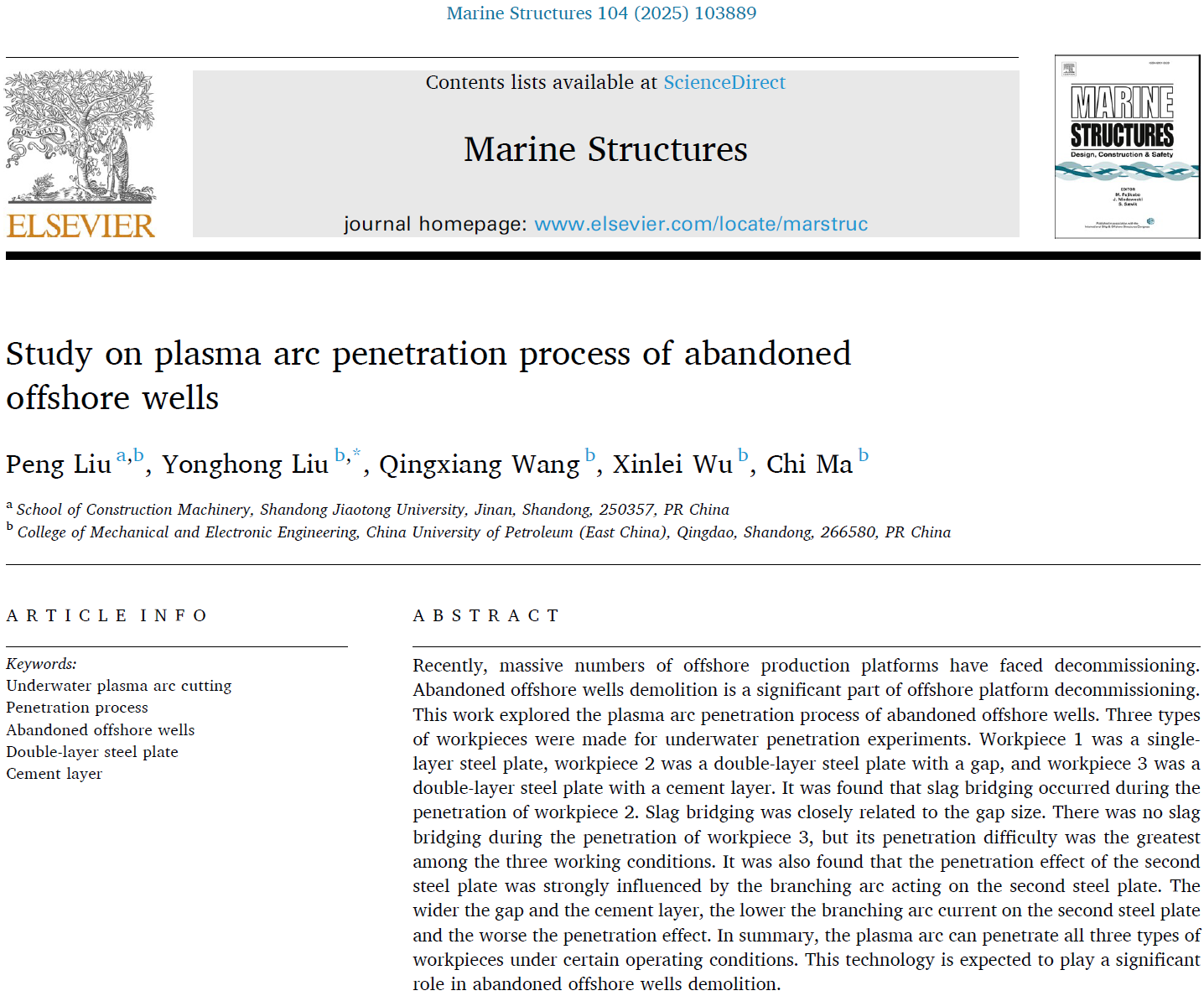 近日,我院刘永红教授团队机械工程专业博士研究生刘鹏在海洋石油废弃井口多层套管水下等离子弧穿透方面取得重要进展,相关研究成果《海洋废弃井口等离子弧穿透过程研究》(Study on plasma arc penetration process of abandoned offshore wells)发表在《Marine Structures》。《Marine Structures》是海洋工程领域的国际权威期刊,目前影响因子为5.1(SCI二区)。论文第一作者为博士研究生刘鹏,通讯作者为刘永红教授,中国石油大学(华东)为唯一通讯单位。该研究得到国家重点研发计划项目资助。