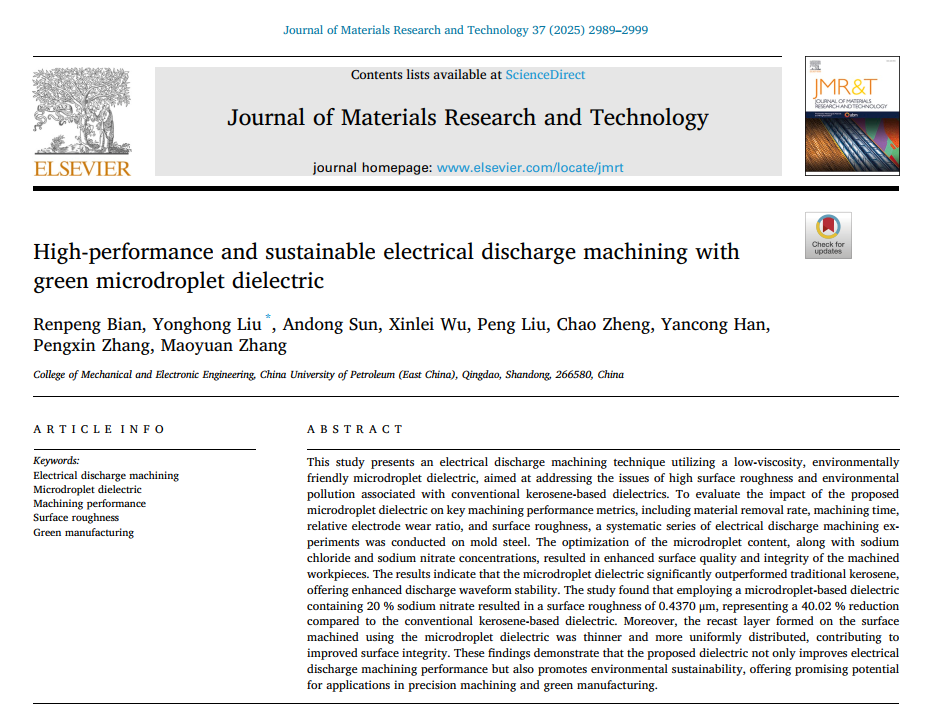 近日,我院刘永红教授团队机械工程专业博士研究生卞仁鹏在电火花加工研究方面取得重要进展,相关研究成果《采用绿色微水滴电介质的高性能和可持续电火花加工》(High-performance and sustainable electrical discharge machining with green microdroplet dielectric)发表在《Journal of Materials Research and Technology》。《Journal of Materials Research and Technology》是机械制造领域的国际高水平期刊,目前影响因子为6.6(SCI二区)。论文第一作者为博士研究生卞仁鹏,通讯作者为刘永红教授,中国石油大学(华东)为唯一署名单位和唯一通讯单位。该研究得到国家自然科学基金、装备预研教育部联合基金、国家资助博士后研究人员计划、山东省博士后创新项目等的资助。