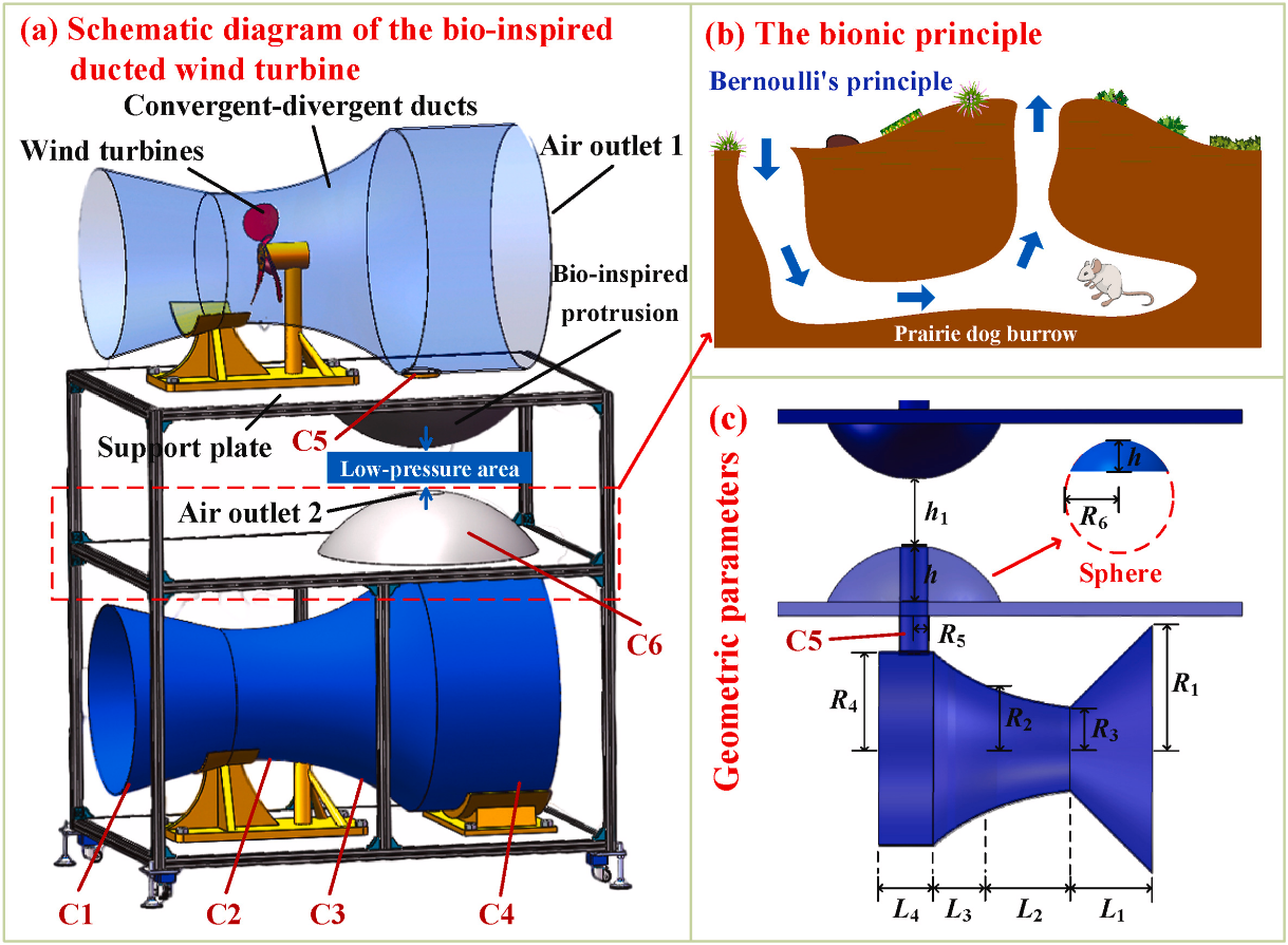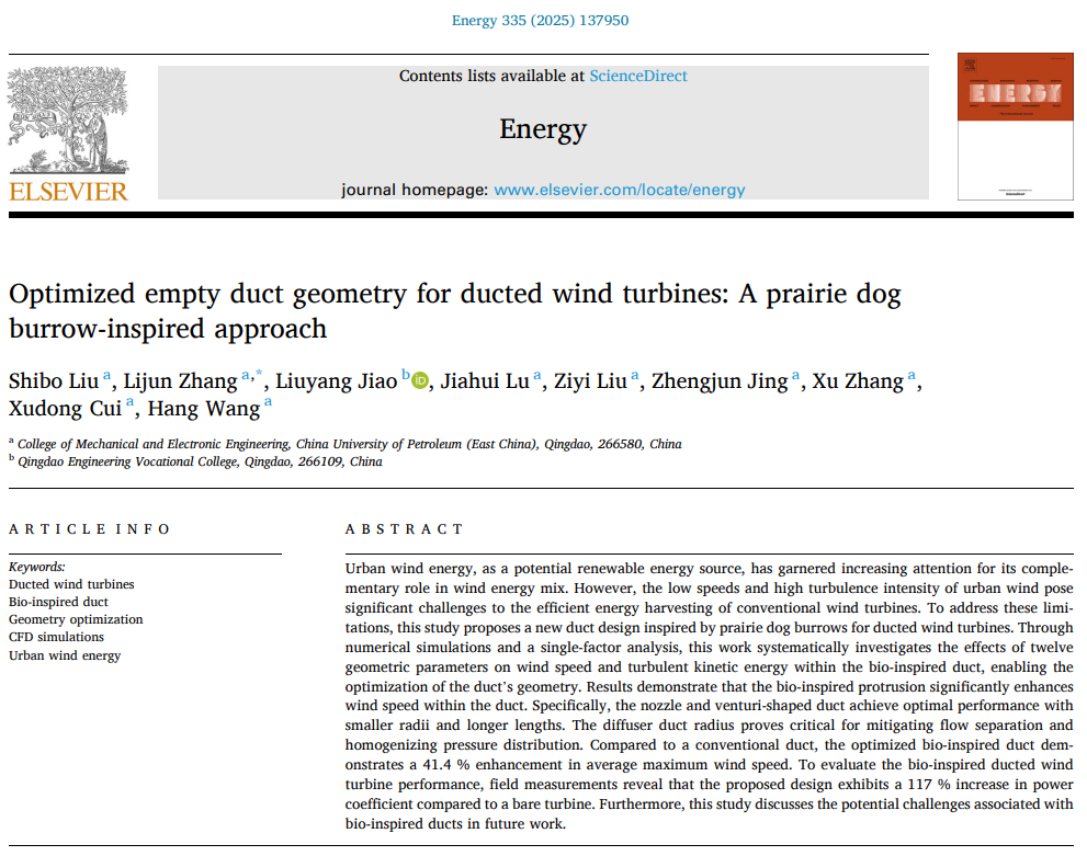 近日,我院张立军教授团队在城市用管道式风力发电机研究领域取得阶段性进展,相关成果《管道式风力发电机空管道的几何优化:一种草原犬鼠洞穴的仿生方法》(Optimized empty duct geometry for ducted wind turbines:A prairie dog burrow-inspired approach)发表在《Energy》。该期刊是国际能源领域的知名学术期刊,覆盖能源科学与工程的多学科前沿,最新影响因子为9.4(SCI一区Top)。论文第一作者为博士研究生刘世博,通讯作者为张立军教授,中国石油大学(华东)为第一署名单位和唯一通讯单位。该研究得到山东省自然科学基金项目、山东省科技型中小企业创新能力提升工程项目和新疆伊吾县科技创新专项资金项目的资助。