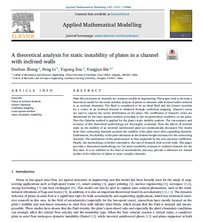 近日,我院石永军教授团队在板类结构流固耦合稳定性分析领域取得阶段性进展,相关成果《倾斜通道中板的静态失稳理论研究》(A theoretical analysis for static instability of plates in a channel with inclined walls)发表在《Applied Mathematical Modelling》。期刊专注于工程与环境过程、制造及工业系统的数学建模相关研究,涵盖传热、流体力学、固体力学与金属力学、计算机辅助工程相关的软件工程、材料与冶金工程等方向,最新影响因子为5.1(SCI二区)。文章第一作者为我院张德春老师,通讯作者为石永军教授,中国石油大学(华东)为第一署名单位和唯一通讯单位。该项研究获得了山东省自然科学基金的资助。