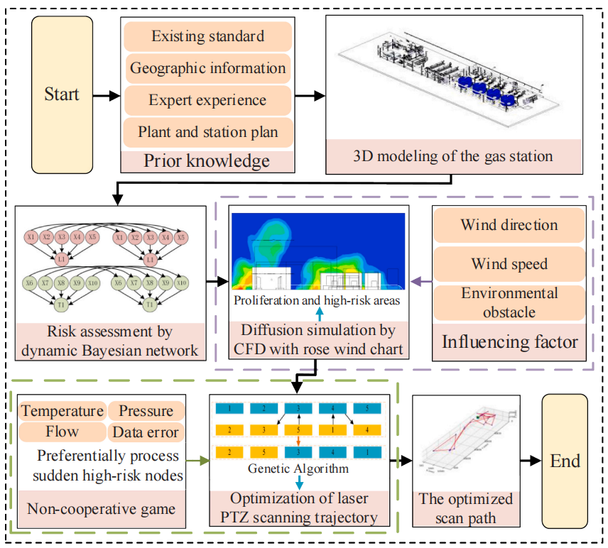 本研究提出一种全面优化方案,旨在提升液化天然气站点的气体泄漏监测效能。传统扫描路径规划通常依赖经验性扫描点布置,缺乏理论支撑,难以适应复杂站点结构与动态风险变化。优化流程始于创建三维模型,该模型捕捉设备及其环境的空间细节,为后续风险评估奠定基础。动态贝叶斯网络(DBN)整合历史数据、实时监测信息及专家见解,评估设备状态并识别高风险区域。随后通过计算流体动力学(CFD)模拟建模气体扩散过程,生成精细的气体云分布图,从中提取关键扫描点。最后采用非合作博弈理论框架结合遗传算法(GA),基于提取的扫描点和识别的高风险区域优化激光平台的扫描轨迹。该方法可实现扫描路径长度缩短37.8%、检测精度提升22%,并显著降低能耗与检测时间。这些改进为泄漏监测提供了更高效、更具成本效益的解决方案,在实际液化天然气站点的扫描效率、安全性及运营成本方面均优于传统方法。
