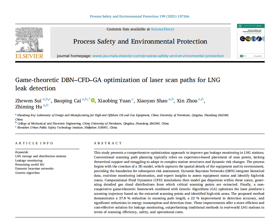 近日,我院机械工程专业硕士研究生隋哲文在液化天然气泄漏检测的方法方面取得重要进展,相关研究成果《基于博弈论的DBN-CFD-GA方法用于液化天然气泄漏检测的激光扫描路径设计》(Game-theoretic DBN–CFD–GA optimization of laser scan paths for LNG leak detection)发表在《Process Safety and Environmental Protection》。《Process Safety and Environmental Protection》是工艺安全与环境领域的国际顶级期刊,目前影响因子为7.8。论文第一作者为硕士研究生隋哲文,通讯作者为蔡宝平教授,中国石油大学(华东)为唯一通讯单位。该研究得到了国家重点研发计划、国家自然科学基金、工信部高技术船舶科研项目、山东省杰出青年基金以及“泰山学者”项目等的联合资助。