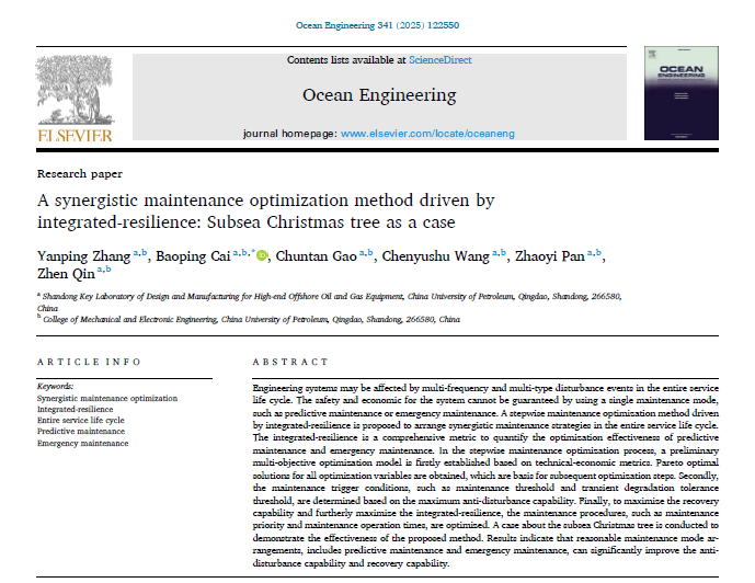 近日,我院机械工程专业博士研究生张妍平在海洋石油装备维修优化方法方面取得重要进展,相关研究成果《综合韧性驱动的协同维修优化方法:以水下采油树为例》(A synergistic maintenance optimization method driven by integrated-resilience: Subsea Christmas tree as a case)发表在《Ocean Engineering》。《Ocean Engineering》是海洋工程领域的国际顶级期刊,目前影响因子为5.5。论文第一作者为博士研究生张妍平,通讯作者为蔡宝平教授,中国石油大学(华东)为唯一通讯单位。该研究得到了国家重点研发计划、国家自然科学基金、工信部高技术船舶科研项目、山东省杰出青年基金以及“泰山学者”项目等的联合资助。