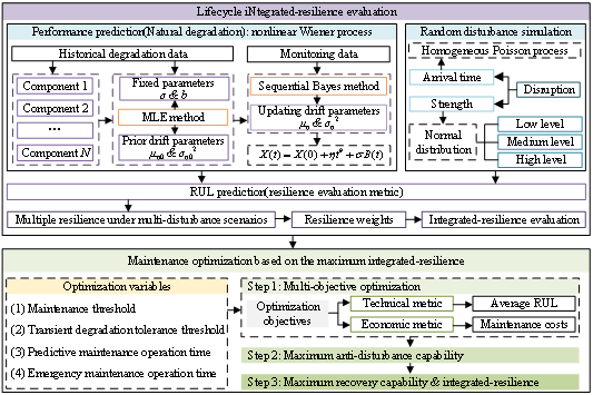 工程系统在其全寿命周期内会受到多类型和多频次的干扰事件影响。仅采用单一的维修模式,如预测性维修或应急维修,无法保证系统的安全性和经济性。本文提出了一种由综合韧性驱动的分步维修优化方法,协同安排全寿命周期内的维修策略。全寿命周期内的综合韧性是量化预测性维修和应急维修优化效果的综合指标。首先,基于技术经济指标建立初步的多目标优化模型,获得所有优化变量的帕累托最优解,这是后续优化步骤的基础。其次,根据最大抗干扰能力确定维修触发条件,如维护阈值和瞬态退化容限阈值。最后,为了最大限度地提升恢复能力并进一步增强其系统韧性,对维修优先级和维修操作时间等流程进行了优化。以海底采油树为例,展示了所提方法的有效性。