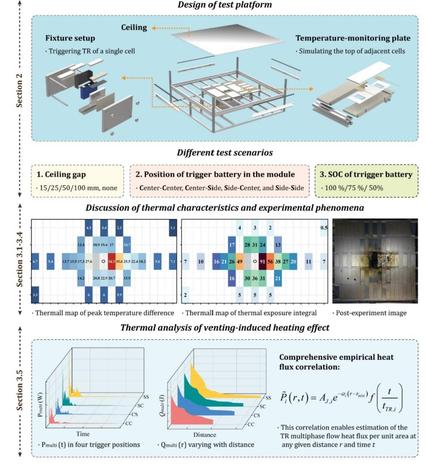 基于此,本研究选取LFP电池为对象,搭建具代表性的半封闭实验平台,结合多点布设的温度监测阵列,系统性评估了未点燃排气对模组内其他电池的热影响强度与分布特征。进一步,提出基于实验数据拟合的排气热通量经验关联式,为TRP建模与电池安全结构设计提供定量化边界输入条件。研究的整体工作流程如图1所示。